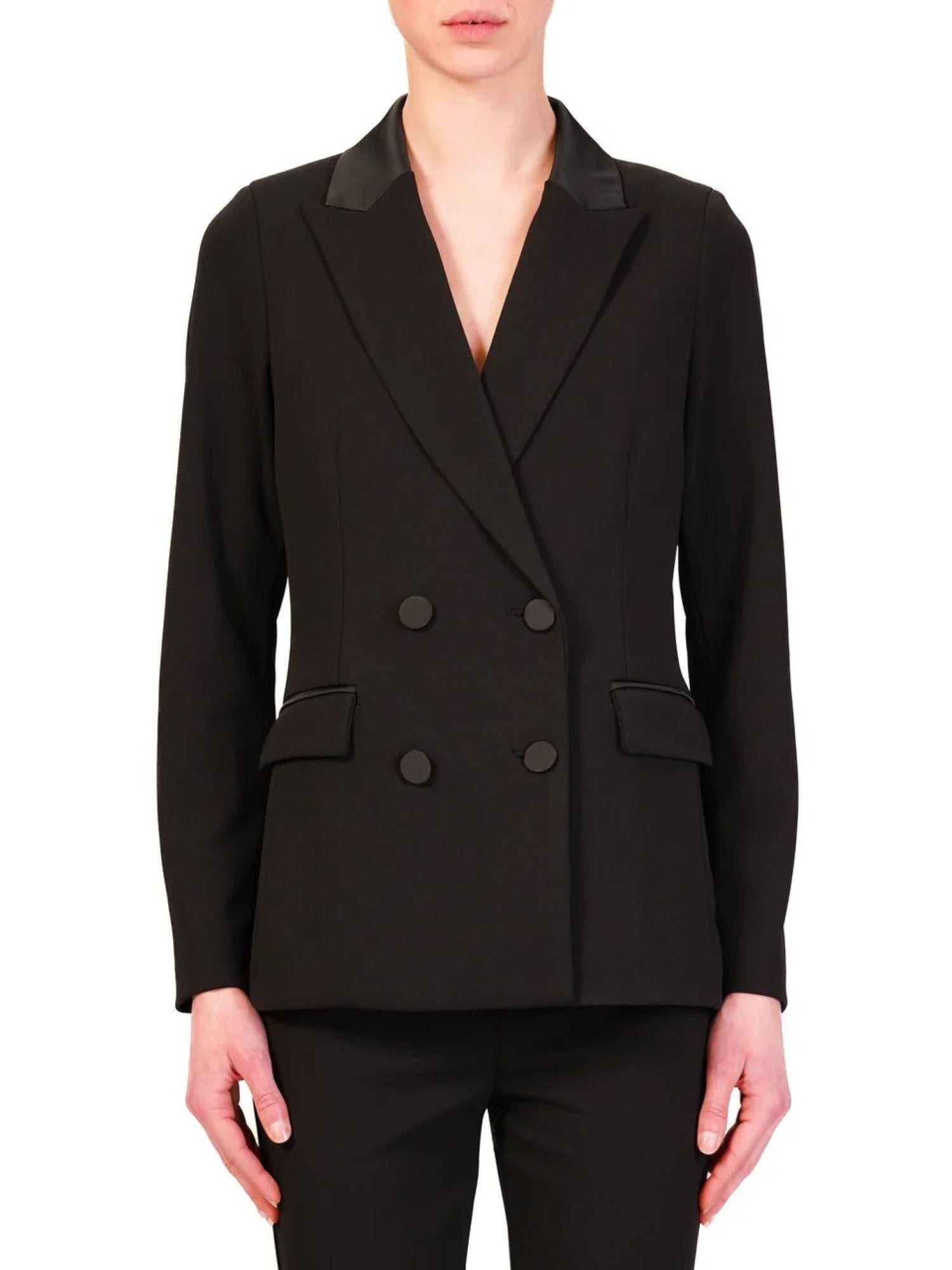 Scoprite l'eleganza senza tempo della giacca blazer doppiopetto in crepe nero firmata Vicolo. Questo raffinato capo da donna è realizzato in un tessuto crepe stretch di alta qualità, pensato per garantire comfort e una vestibilità impeccabile in ogni occasione.