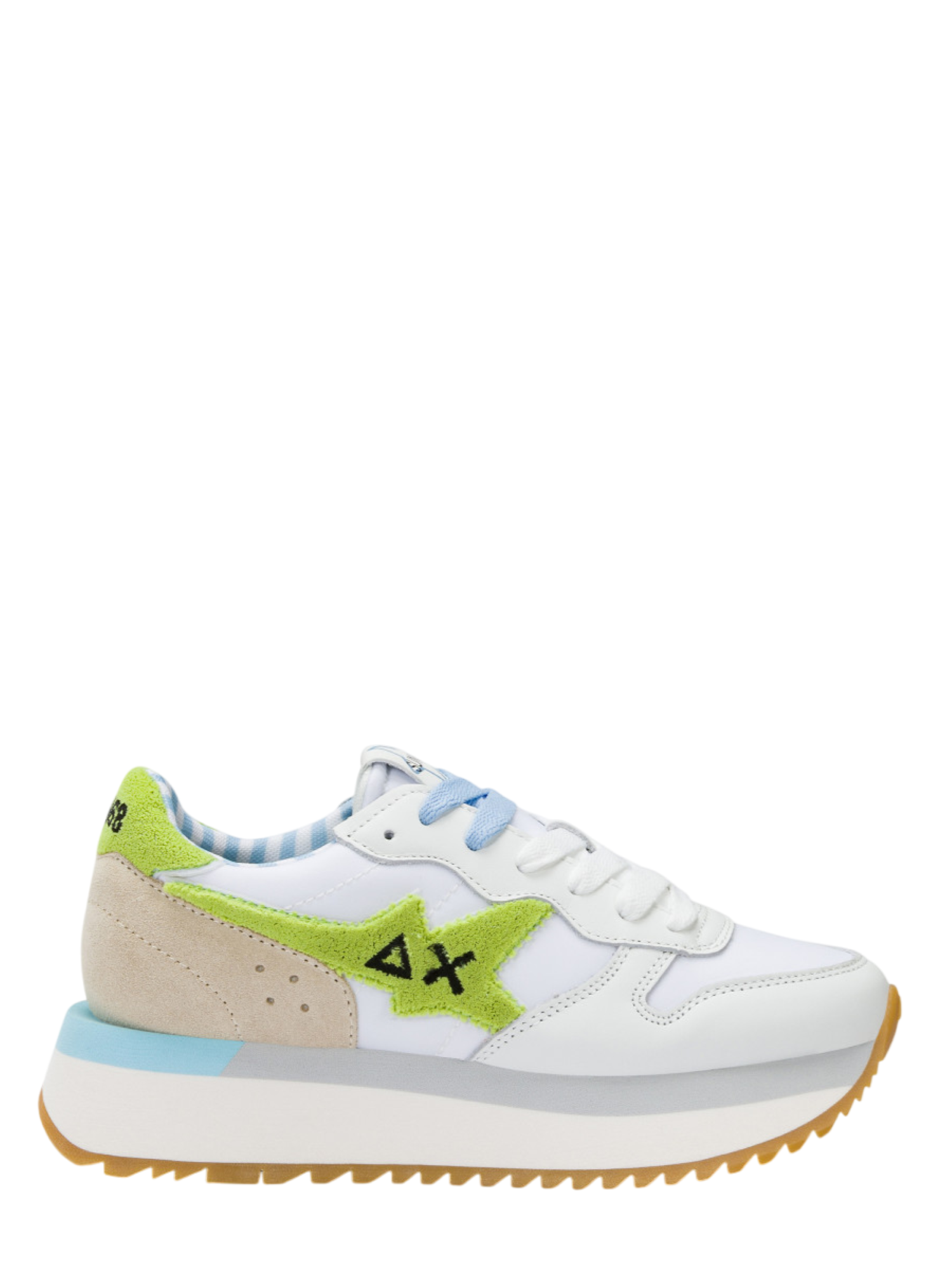 Scopri le Sun68 sneakers Big Stargirl Spongee Logo nella raffinata combinazione di bianco, verde e lime, un accessorio imperdibile per ogni donna che desidera unire stile e comfort. Queste sneakers platform sono caratterizzate da un design innovativo a blocchi di colore, in grado di catturare l'attenzione e conferire un tocco di vitalità al tuo look quotidiano.