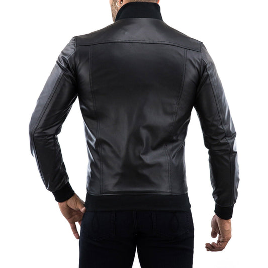 Bomber Giubbotto In Vera Pelle Nera Uomo Slim Tasche Con Cerniera Rindway